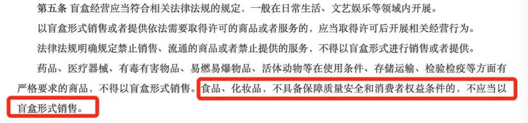 药品、医疗器械、特殊化妆品、有毒有害物品、易燃易爆物品、活体动物、无着快件、食品等在使用条件、存储运输、检验 检疫、监督管理等方面有严格要求的商品,不得以盲盒形式销售。
